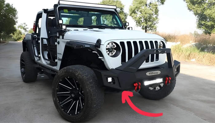 Transform your Jeep with must-have accessories: rugged steel front bumper, all-terrain wheels, powerful LED headlights, rear window liftgate lamp, and door-off mirrors. Elevate both style and functionality!